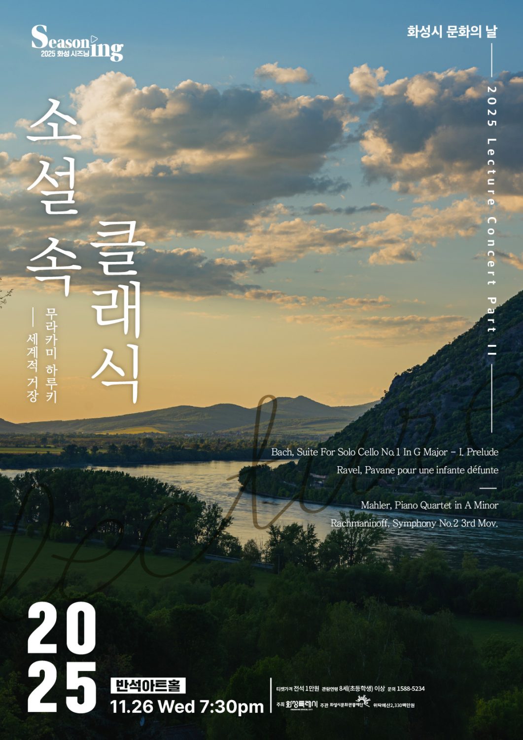 세계적 거장들의 영화와 글 속 울림이 클래식 명곡과 만나 새로운 감동으로 되살아난다. 영화 속 감동을 더해주는 아름다운 오페라 곡으로 구성된 <영화에 녹아 든 오페라>와 전 세계가 사랑하는 현대문학의 거장 무라카미 하루키의 작품 세계 속 음악을 담아낸 <소설 속 클래식>까지! 한 달에 한 번, 화성시 문화의 날에 만나는 렉처 콘서트로 삶의 활력을 느껴보자.