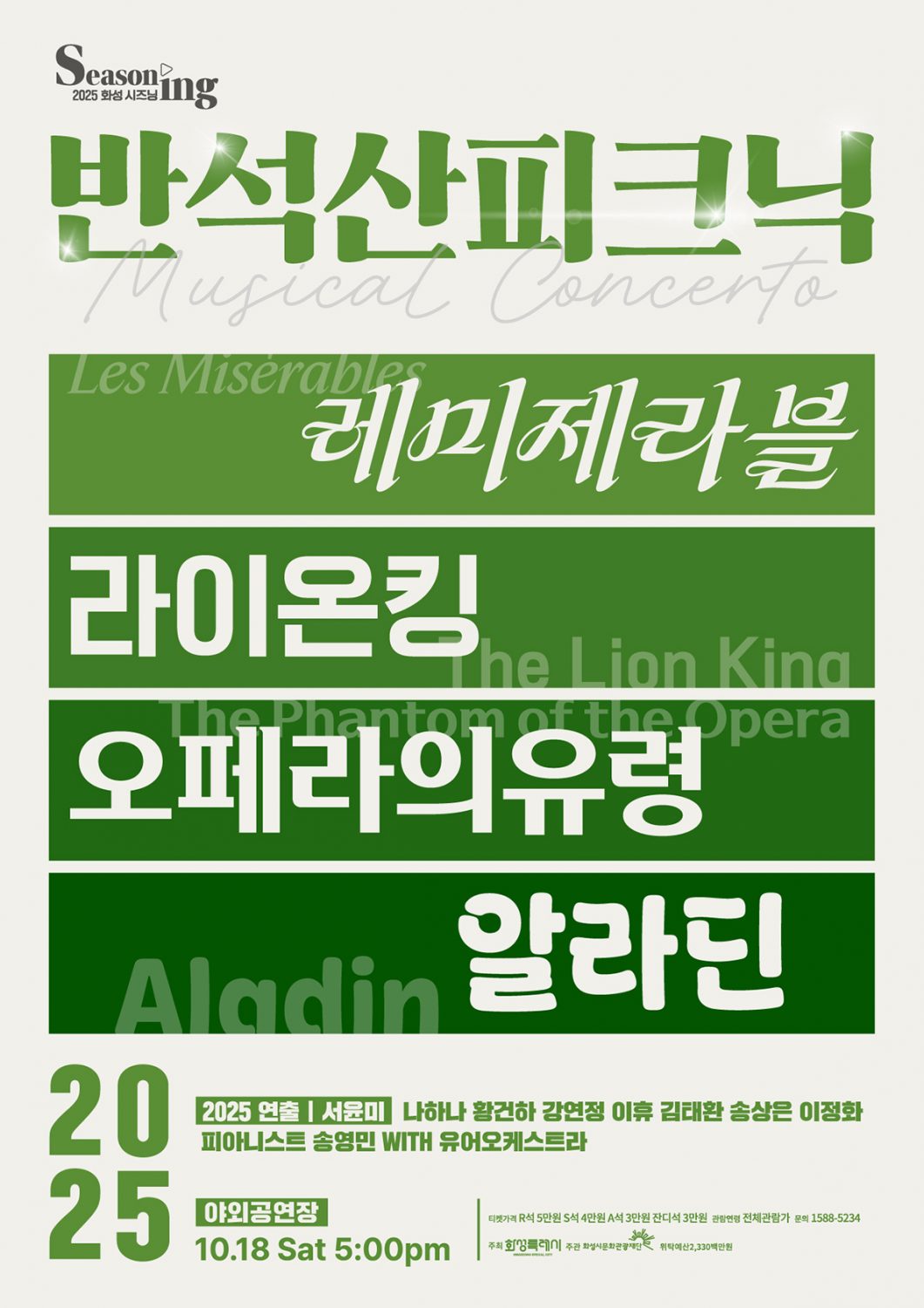 <레 미제라블>, <오페라의 유령>, <알라딘>, <블랙메리포핀스>, <프랑켄슈타인> 등 전 세계를 사로잡은 뮤지컬 명곡들과 함께 국내 창작뮤지컬의 넘버까지! 강연정, 김태환, 나하나, 송상은, 이정화, 이휴, 황건하 그리고 피아니스트 송영민과 유어오케스트라가 함께 만드는, 가을 저녁을 수놓을 단 한 번의 뮤지컬 콘체르토.
